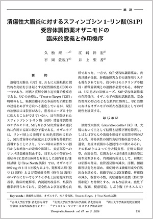 [Ther. Res. オープンアクセス] 潰瘍性大腸炎に対するスフィンゴシン 1-リン酸(S1P)受容体調節薬オザニモドの臨床的意義と作用機序(2026年3月号) 糖尿病診療における心理的側面からのアプローチ -自己効力感の重要性-(2026年3月号) 潰瘍性大腸炎診療における血清アミロイドA(SAA)の有用性(2026年3月号) わが国における糖尿病性腎症の診療実態と課題に関する医師対象アンケート調査結果(2026年3月号)